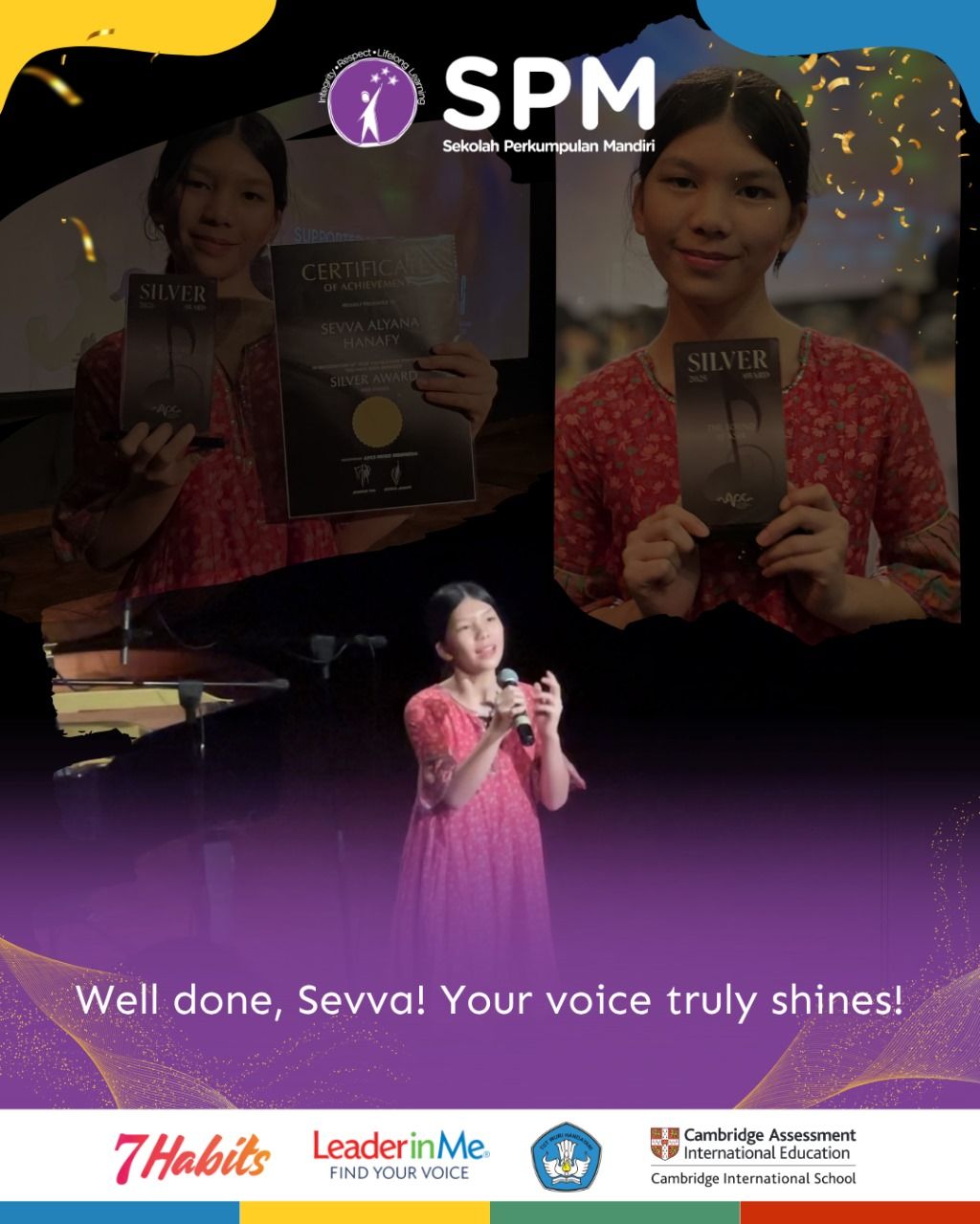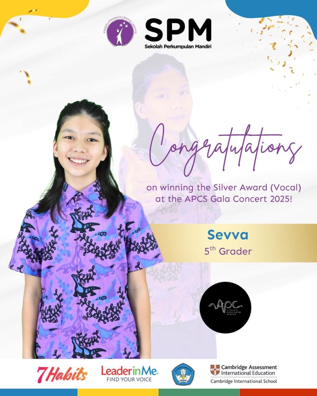 This remarkable accomplishment is a testament to Sevva's hard work, dedication, and incredible talent. The APCS Gala Concert is a significant event, and to win an award in the vocal category requires not only a beautiful voice but also immense courage, discipline, and stage presence.